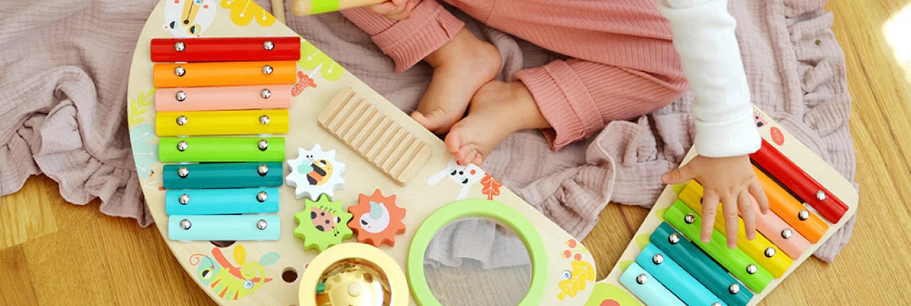 Hudobný pultíkStaňte sa dirigentom vlastnej melódieTento multifunkčný drevený hudobný pultík ponúka deťom priestor na prvé „koncerty“ priamo v detskej izbe. Obsahuje xylofón, bubienok, činely, paličky aj malé ozubené kolieska na objavovanie zvukov a pohybu. Čím si získa vaše deti?Umožňuje rozvo..