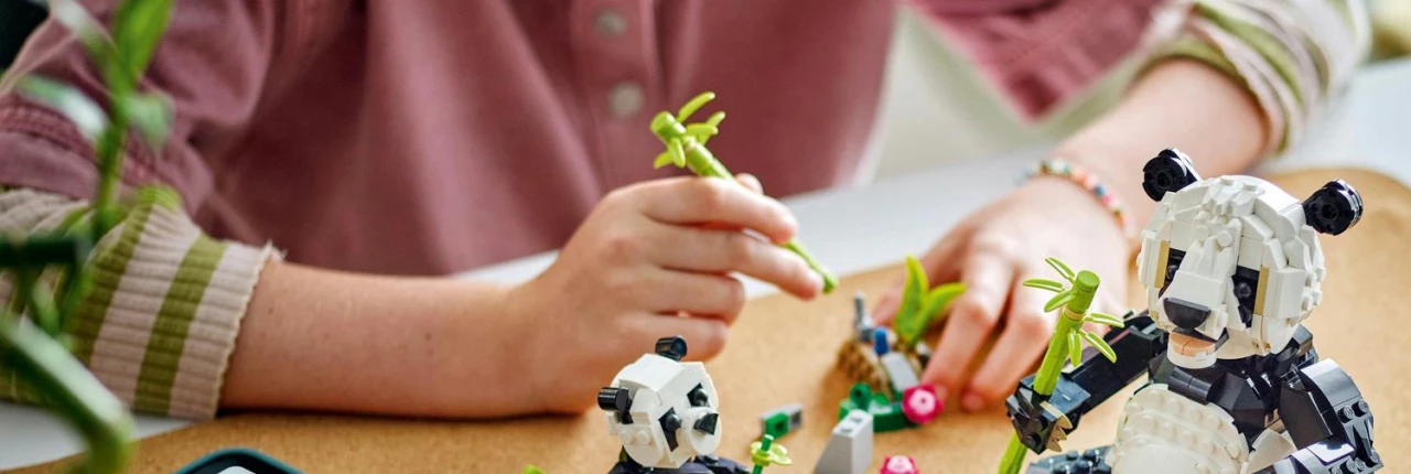 LEGO CREATOR Divoké zvieratá: Pandia rodinka Panda s mláďaťom v džungli Model pandy môžeš prestavať na kosatku s mláďaťom, ktoré plávajú v oceáne, aj na tučniaka s mláďaťom v ľadovej krajine. Z kociek postavíš vždy jednu zvieraciu rodinku. Ktorá zvieracia rodinka u teba zvíťazí?Panda pohybuje p..
