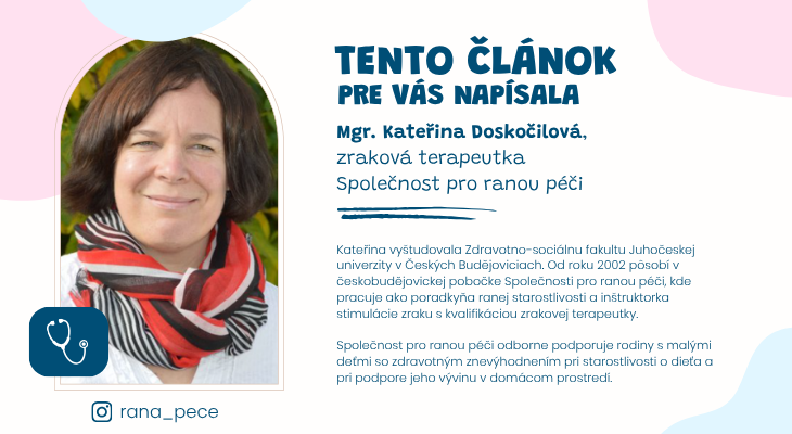 V prípade, že vnímate u dieťaťa odlišný vývoj či netypické reakcie, je možné sa obrátiť na ranú starostlivosť Spoločnosti pre ranú starostlivosť (www.ranapece.cz). Poskytujeme konzultácie aj praktickú podporu v oblasti zrakového vývoja dieťaťa.